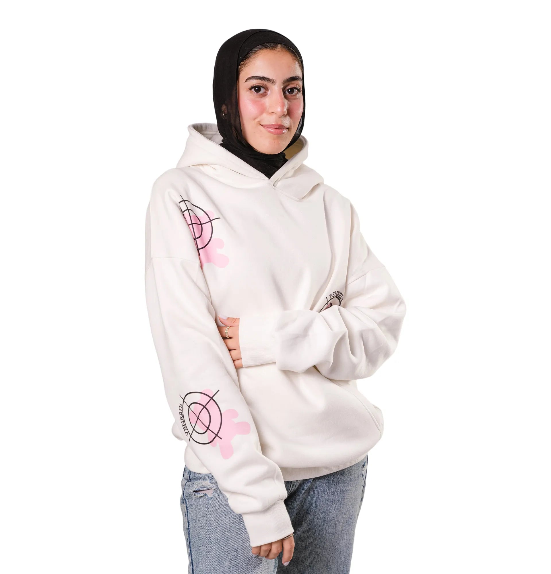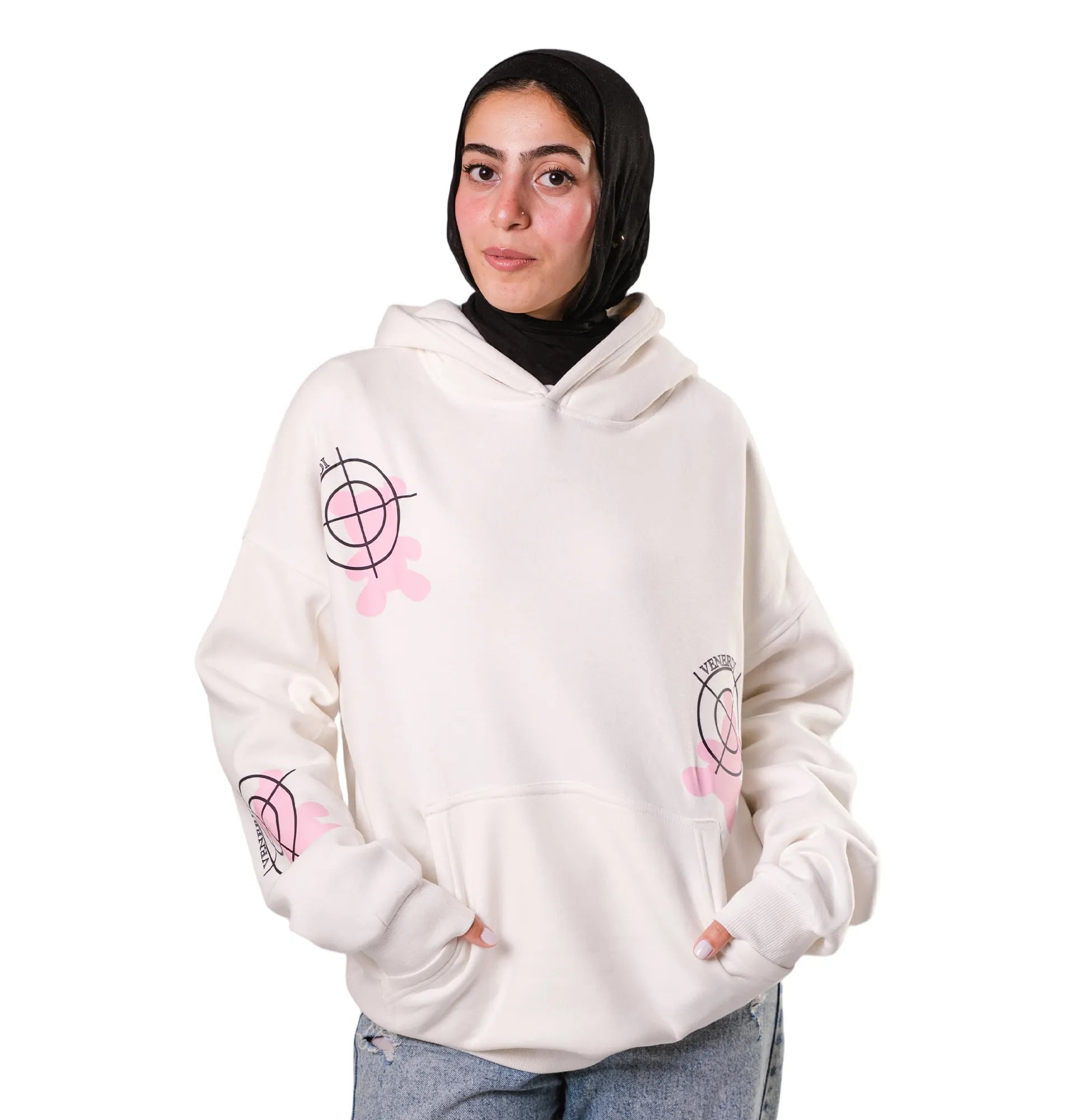 Front: minimalist target with pink blooms on chest and sleeves.